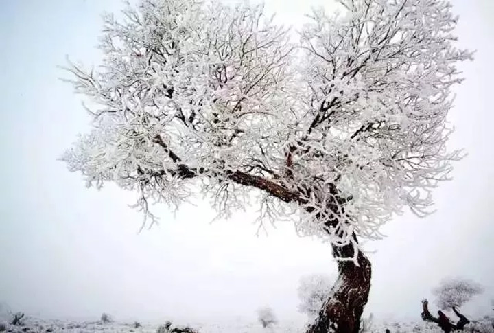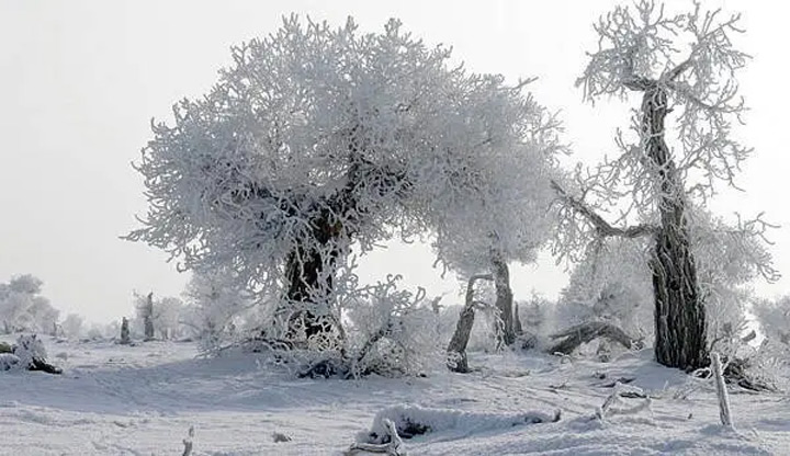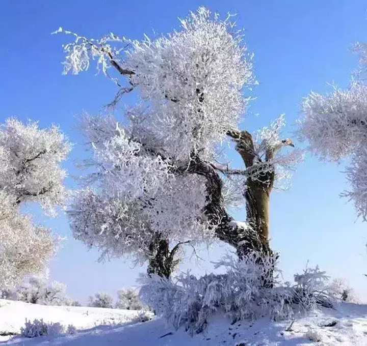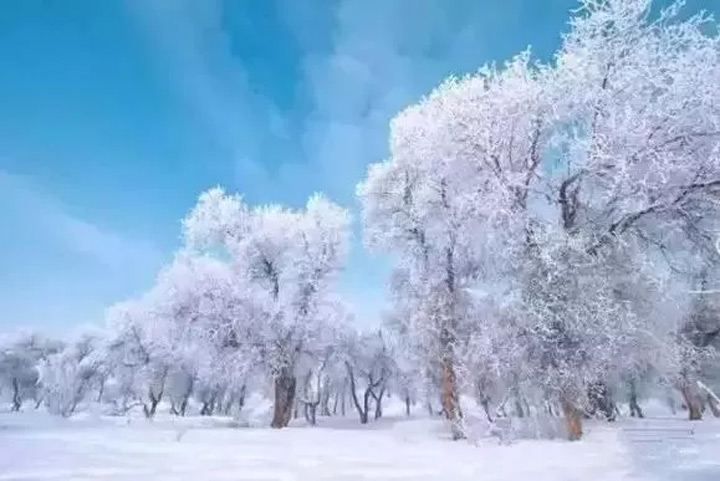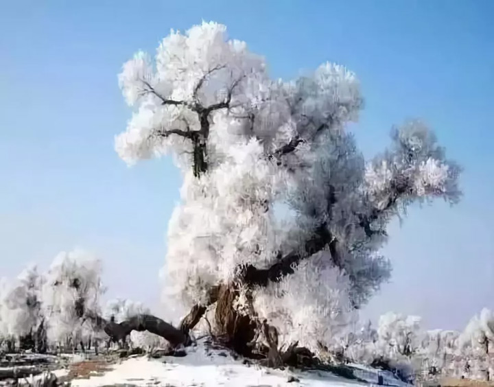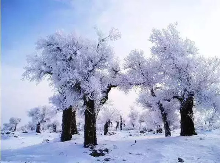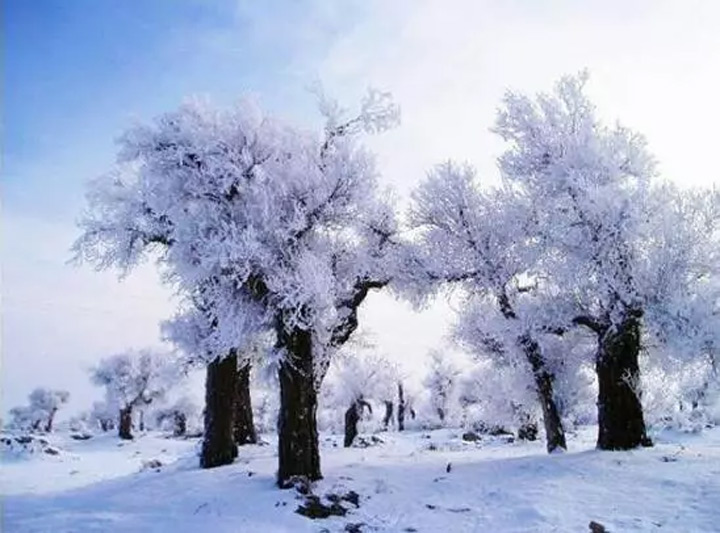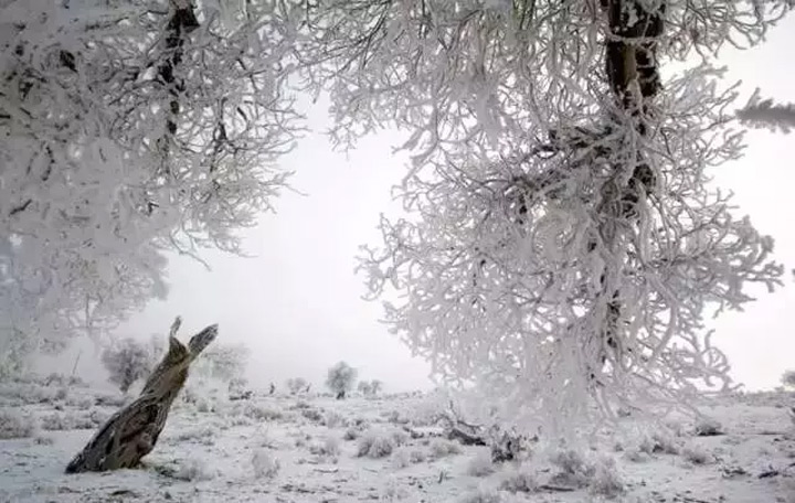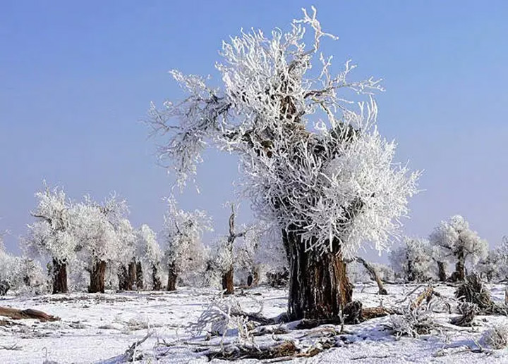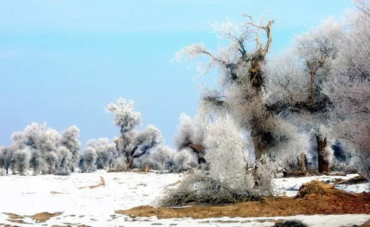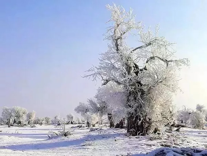 一夜暴雪,胡楊林銀裝素裹,好似千樹萬樹梨花開。