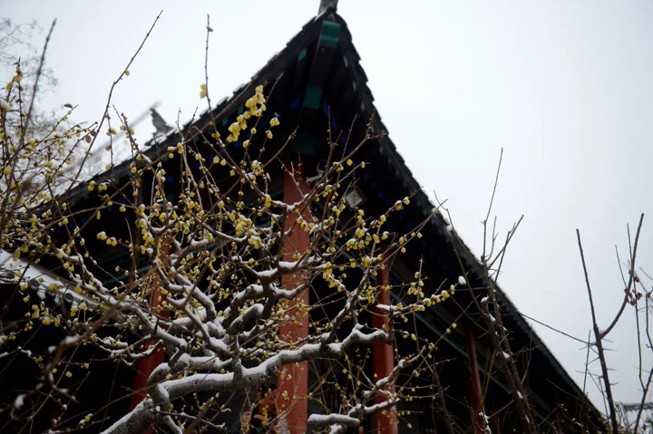 千佛山蠟梅園裡有蠟梅五百餘株,品種眾多,素心梅、九英梅等次第開放,縷縷暗香縈繞著眾佛與禪寺,和著那香火,讓來來往往的人更加虔誠沉醉。