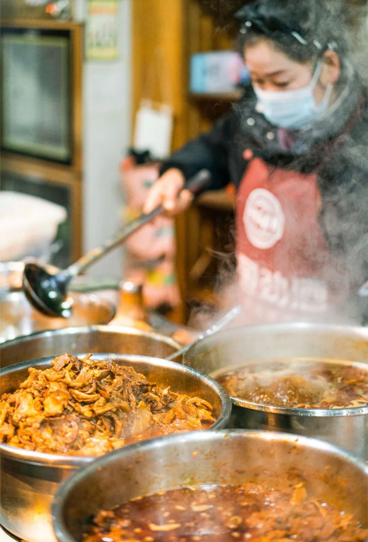 牛雜不甘示弱。經驗老到的老闆們,早早就把牛蹄筋、牛肚、牛百葉、牛骨頭、牛腩滷製熬煮得軟爛入味,混在一起交織出複雜有層次的口感,彈牙、軟糯、嫩滑……越嚼越有味。