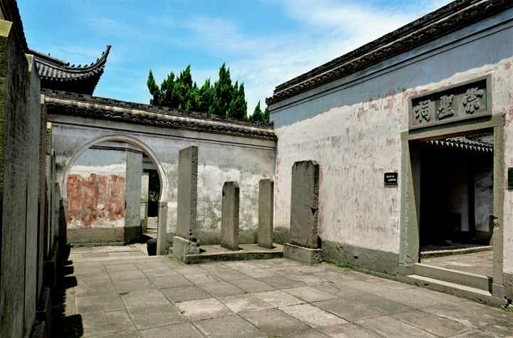 從東側入口進入慈城,沿著太陽殿路走。在民權路左轉,烏瓦紅牆的↑孔廟坐落在慈城中心位置,最早建於宋雍熙元年,後遷址於此,並由蟄縣縣令王安石撰寫碑記《慈豁縣建學記》。據說它的歷史比北京孔廟還要早318年。