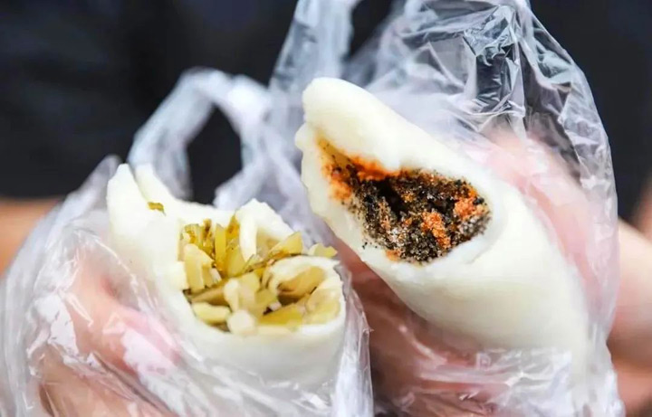 ↑年糕餃的做法有點類似我們常吃的粢飯團。年糕的柔軟包住了油條的脆、芝麻糖的甜、筍絲的鮮...... 整一口下去,只有滿滿的幸福。