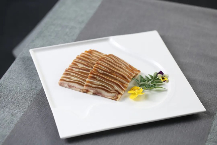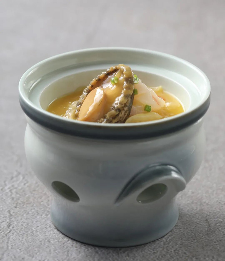 翅湯文火慢煮7小時,湯色濃稠黃亮,絲滑濃郁,唇齒清甜。用自然的方法,借助陽光和風,肥美的白菜慢慢散失水分,鮮美的味道一點點凝聚,絲絲入扣的酸菜心便是最好的增味品。濃稠的金湯佐以珍貴的食材,鮑魚、蝦仁軟中帶脆,既能體會到食材本身的鮮味,又能品嘗到濃郁的湯底味道,可謂色、形、味、器俱佳~