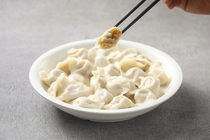 海螺與酸菜是葷與素、海與陸相結合的經典。格外濃郁的酸菜香掩蓋了海螺的腥味,喚醒海產蘊藏的大海之鮮。調餡、醒潤、6.5公分圓皮包裹著飽滿圓潤的餡。一顆餃子,8分餡,2分皮,粒粒藏鮮。一口咬下去,鮮香噴薄而出~