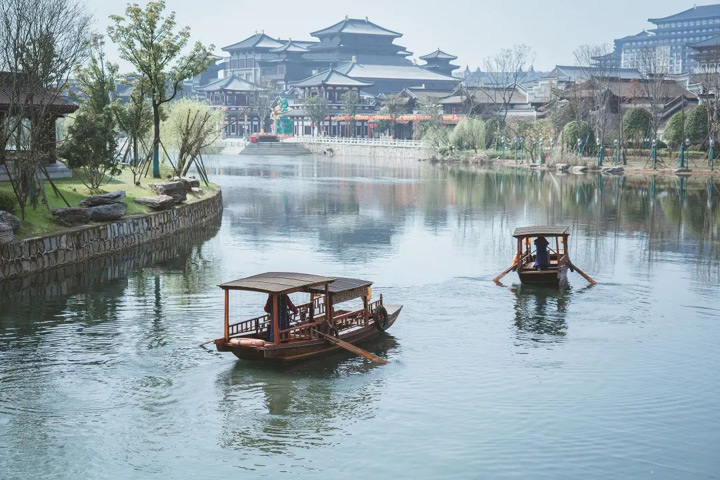 和煦的微風溫柔地拂過湖面,清澈的湖水忽然有了波瀾,搖櫓船緩緩蕩起的盈盈春意,一如星河倒映在遊人眼波。