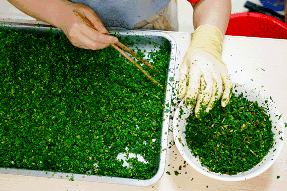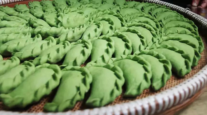 搗青草為汁,色如碧玉。清明時節,吃艾糕、艾餃是紹興人的傳統習俗。用早春艾草芽頭擠出來的汁,將糯米粉染成碧綠色,同時留有清香,還能看得見艾草。剛蒸好的青團雖然有一點黏,卻也沾不上牙齒,軟軟糯糯、筋道又帶著餡兒的香甜氣息,沁人心脾。