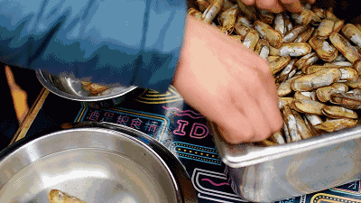 每年的3~5月份都是吃蟶子、蛤蜊等貝殼類水產品的最佳季節,其中,又以蟶子肉質最肥口感最好。此時的蟶子肉質肥壯,色白味鮮,咬下去的每一口都帶著鮮嘖嘖的大海味道,雖帶著腥味卻讓人欲罷不能。蟶子可以生炒,蟶肉也可與蛋、肉等食物拌炒,鮮美可口,還可製成蟶油作調味佳品。不過最暢銷的還是一盤爆炒蟶子,鮮辣的口感是怎麼都不會膩的。
