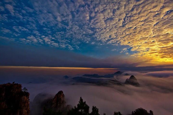 早起看日出是來黃山必做的一件事,當紅日冉冉升起時,遠處的雲海像被鑲上一條金邊,人們如臨大海之濱,彩色的雲海就在眼前,如油畫般美輪美奐。