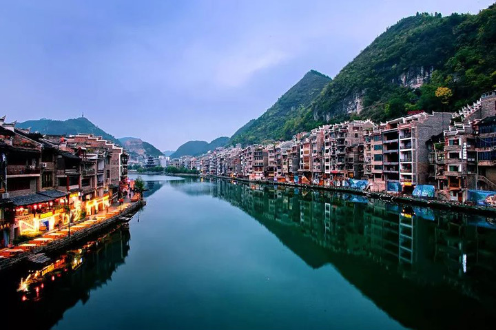 小橋流水、輕煙輕霧、倒映在河水中的瓦房……漫步在鎮遠古鎮青石板路上,看著這滿目的黛色山巒,像一張張古畫。