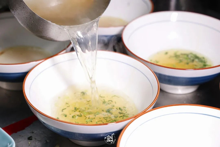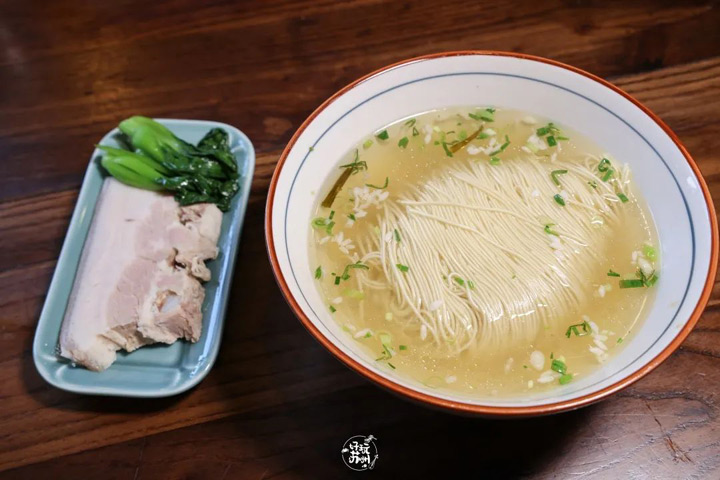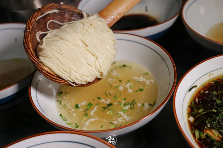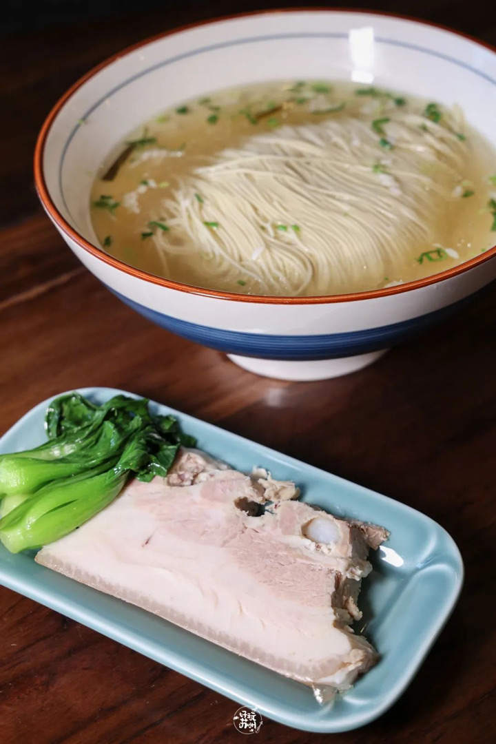 這碗白湯格外鮮。蘇式麵的湯有紅白之分,楓鎮大肉麵是白湯麵中的佼佼者。用鱔骨,大骨等食材熬成的清湯,加入煮燒楓鎮大肉時所得的底滷,便成了楓鎮大肉麵的白湯。