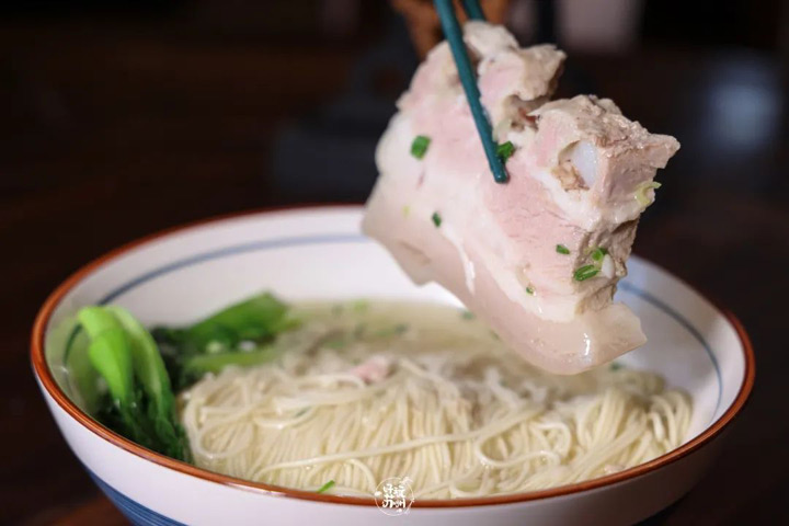這塊大肉不簡單。蘇式麵澆頭裡的燜肉,有紅燜肉和白燜肉之分,楓鎮大肉麵所謂的“大肉”,便是白燜肉改良而成的。