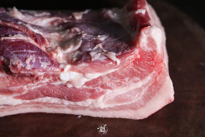 做燜肉,要選取新鮮豬五花的硬肋,肥瘦相間,肥膘處為一指寬甚好,吃起來口感也最好。