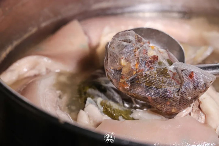 將肉放回鍋中,加入蔥、薑、桂皮、八角等多種調味料燒製,微火燜四個多小時。一整塊豬肉在鍋中不斷“升級”,吸收味道,釋放油脂,就變成酥香可口的楓鎮大肉。