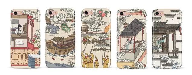 展現了紫禁城北京城、江南微州的特點,無論是當時的建築、人物服飾還是風土人情都在畫面中得到最大程度的展現。這樣的長卷形式不僅展現了故事情節的完整性,而且更有利於人們觀賞。在圖形應用部分作者以日曆、帆布包、手機殼、水杯等日常用品作為載體,使”三慶班京城楊名”的故事得以更好的傳播。