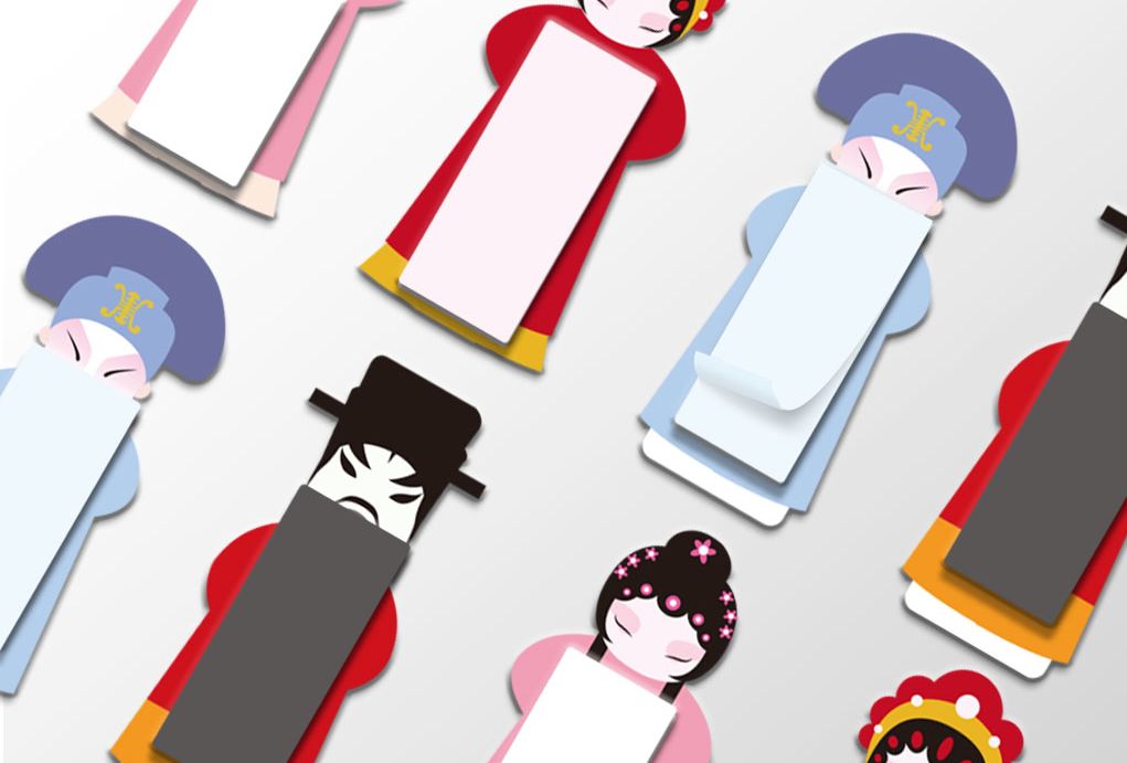 這是一組提取京劇中髯口、水袖的造型特點,設計而成的趣味便籤紙。我們用長長的便籤紙來替代京劇角色的水袖和髯口,揭開一張張便籤紙,就像大家再跟京劇角色來- .場調皮的互動,形像生動有趣,給現代快節奏辦公的環境,帶去些輕鬆詼諧!