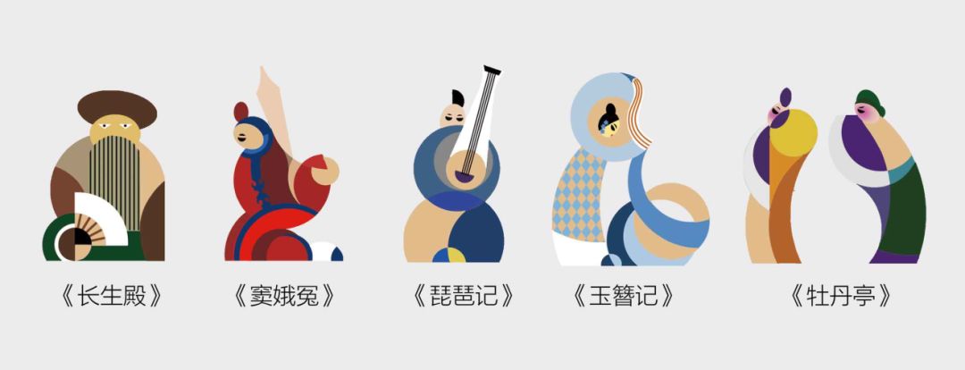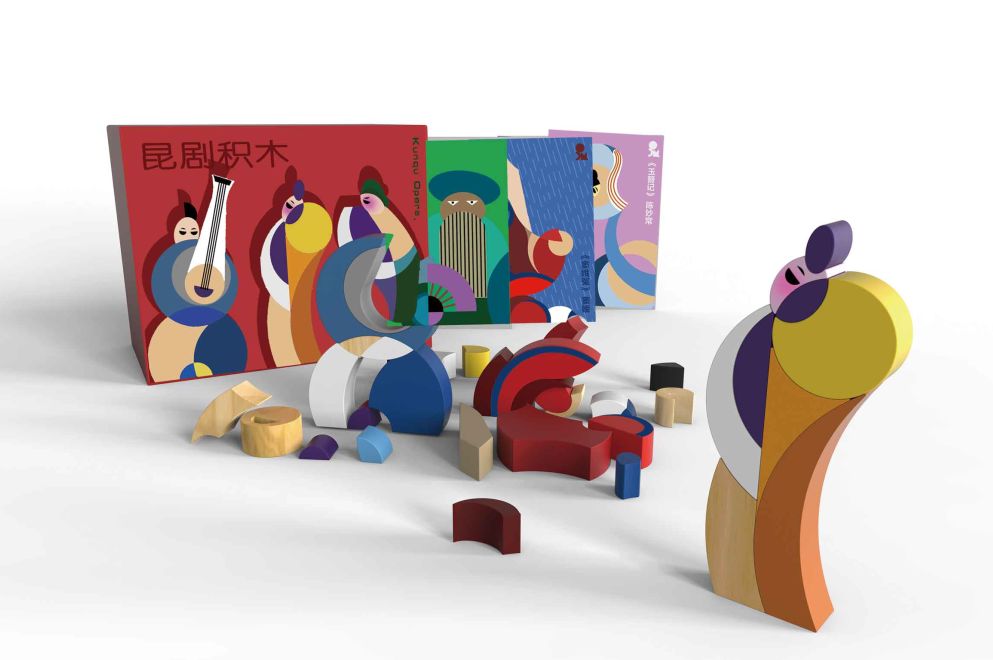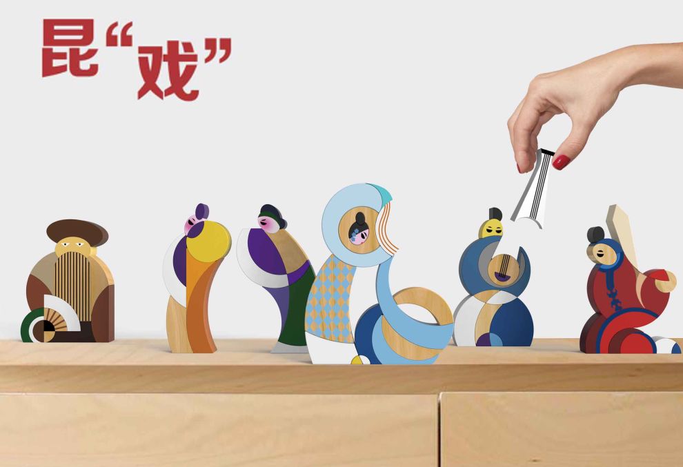 昆“戲”系列產品是根據崑劇劇目中具有代表性的篇章,挑出其有代表性的人物形象,進行幾何化設計,是其更容易被現代年輕人接受。在人物造型上參考了人物在戲劇中具有代表性的舞台服飾、配件包括其動作,製作成可供兒童審美開發以及成年人休閒、擺飾的功能。