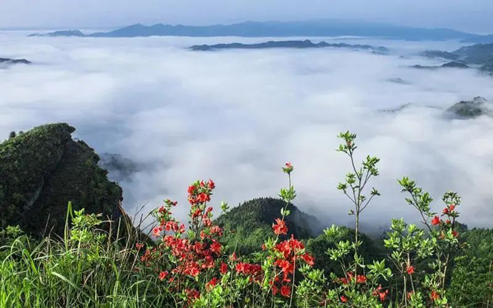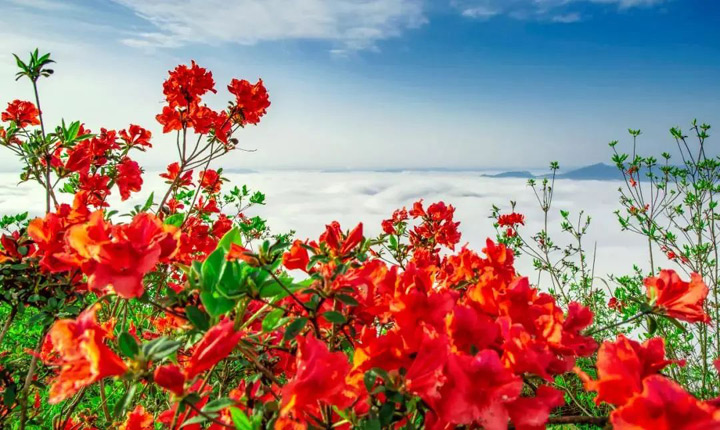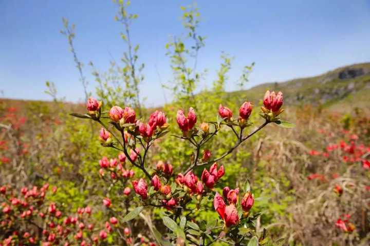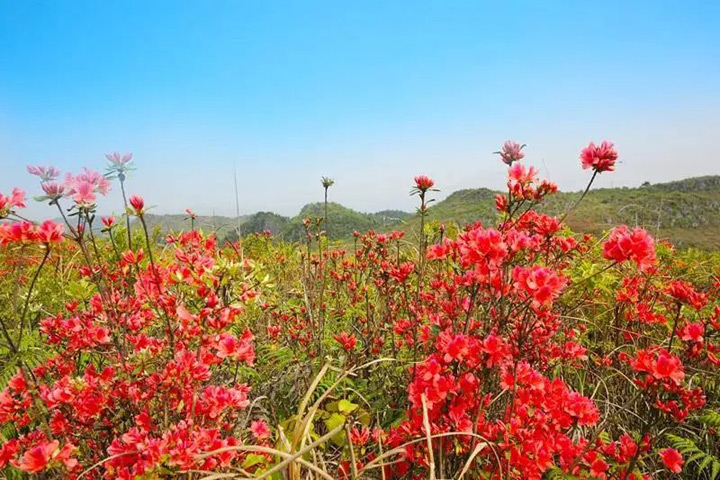 漫山遍野的映山紅開遍山頭,經專家考證,其面積之大、年代之久、保存之好、密度之高、花色之美,堪稱一絕,被金氏世界紀錄協會認定為“世界上面積最大的原生態石板映山紅花海”。