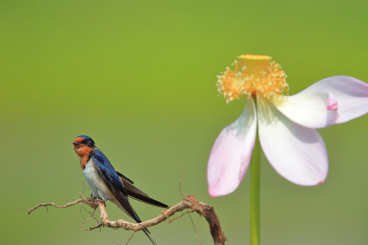 幾隻白鷺、蜻蜓在荷葉間飛翔