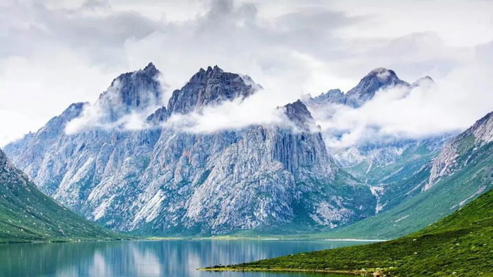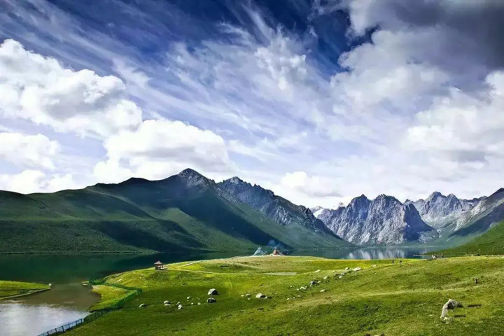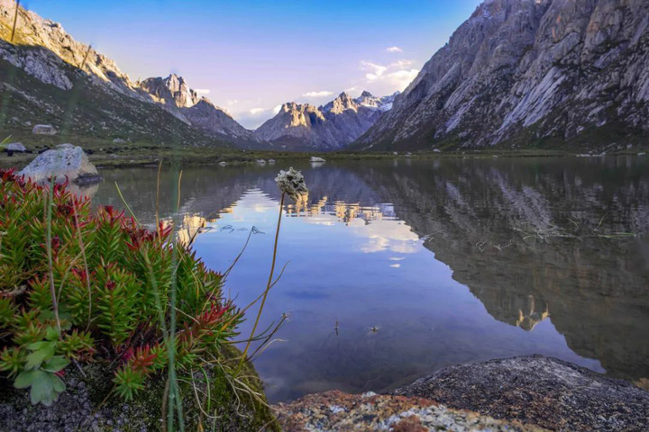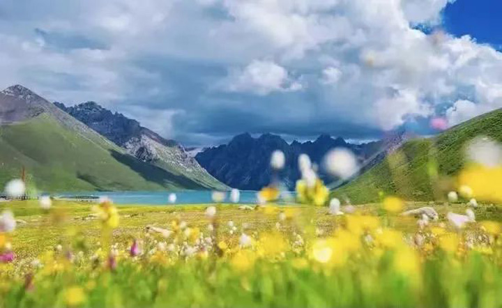 湖的東南西三面群山環繞,湖水超級清澈,站在湖邊能清楚地看見水下的高原湖泊魚。如果你的帳篷就紮在這片湖泊花海邊時,那你肯定會激動地徹夜難眠。