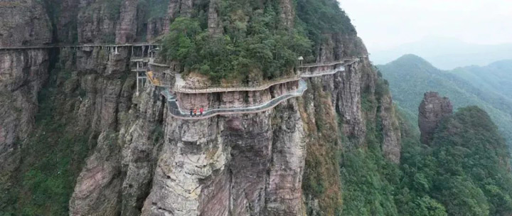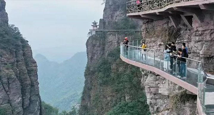 一側靠山,一側是雲霧繚繞的懸崖邊,透明的玻璃棧道使人仿佛淩波於空中,好不驚險。