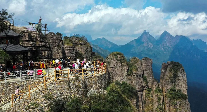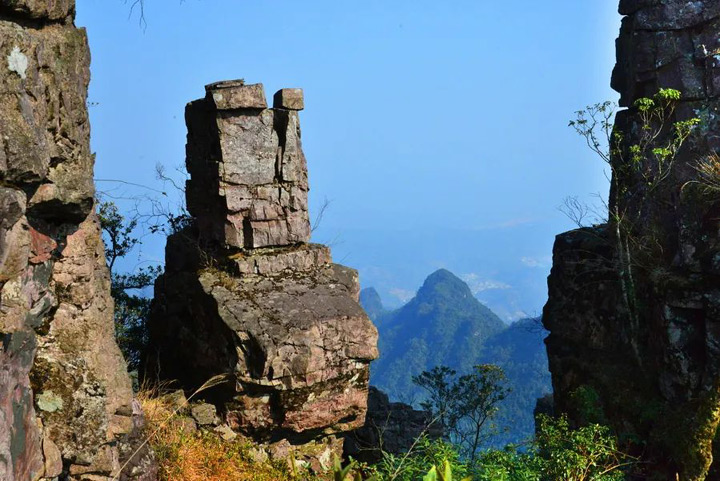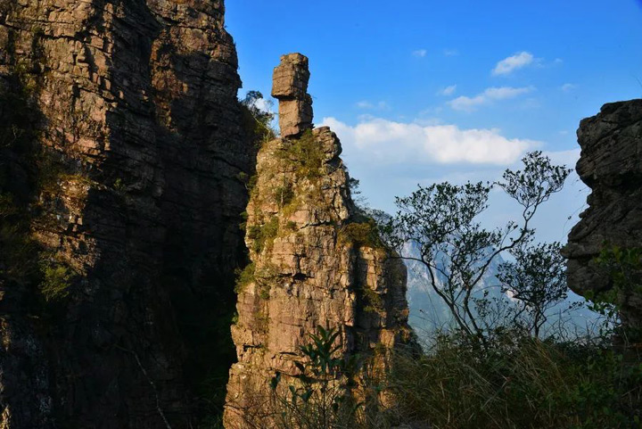 這是有著“萬丈深淵”的大石牆陡壁,高聳且長。從群峰腳下往上看,一個個石林直插雲霄,似是撐起天邊的祥柱;登頂往下看,就是一個陡壁大石牆,一眼數十里,蔚然壯觀。