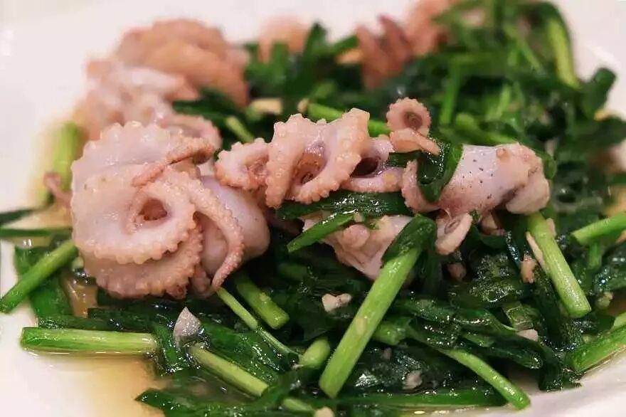 5、6月份的八爪魚,是秦皇島人偏愛的又一道美味。原本軟滑的八爪魚過了火便白嫩鮮脆,本地人喜歡拿它配韭菜,翡翠白玉般的色彩清爽又下飯。
