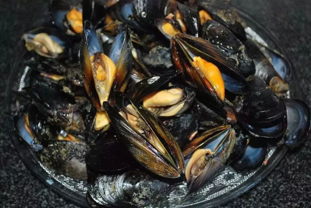 海虹,學名貽貝。野生狀態下生長在礁石上,養殖廠採用纜繩聚養方式飼養,產量大,味道雖沒有蛤蜊鮮美,但沒有泥沙,色澤黃裡透紅,其營養豐富,被譽為海中雞蛋。