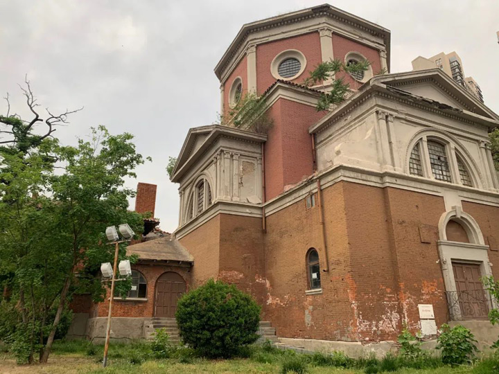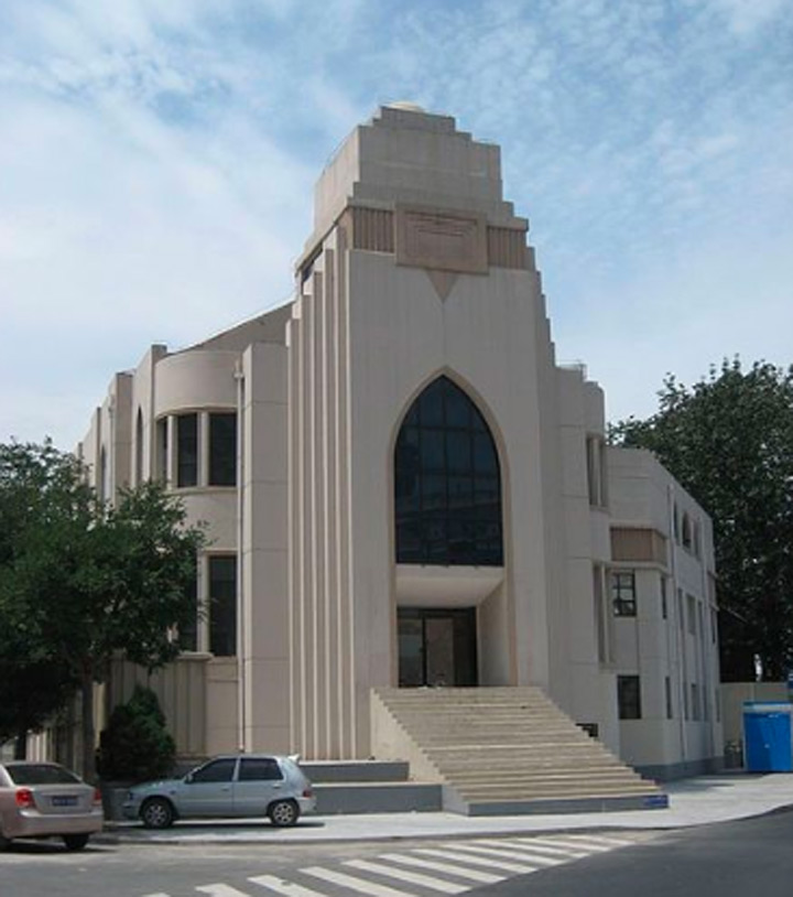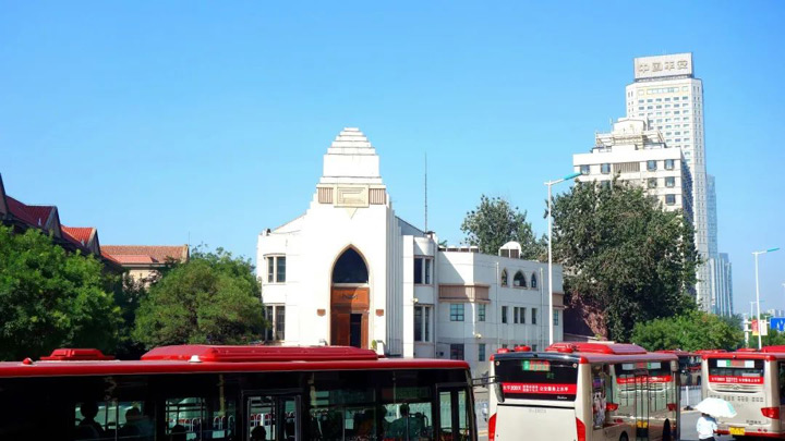 猶太教堂坐落在南京路和鄭州道口,始建成於1940年,哥特式風格,具有歐洲教堂建築的特點。在上個世紀二三十年代,天津一度成為繼上海和哈爾濱之後,當時猶太人在中國大陸的第三大聚居城市。當年天津猶太宗教公會下轄有猶太醫院、猶太養老院、猶太飯堂和猶太公墓等福利救濟機構。