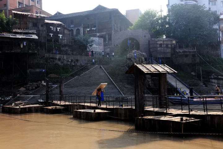 朝天嘴碼頭,始建於明萬曆年間,迄今已有 400 多年歷史,標誌性的 77 步青石臺階通向江邊,是重慶唯一倖存以及長江邊上唯一保存完好的傳統碼頭。置身朝天嘴,偶見挑夫穿行,雖沒有過去的繁榮景象,但一脈相承的碼頭文化始終風韻猶存,令人感歎不已。