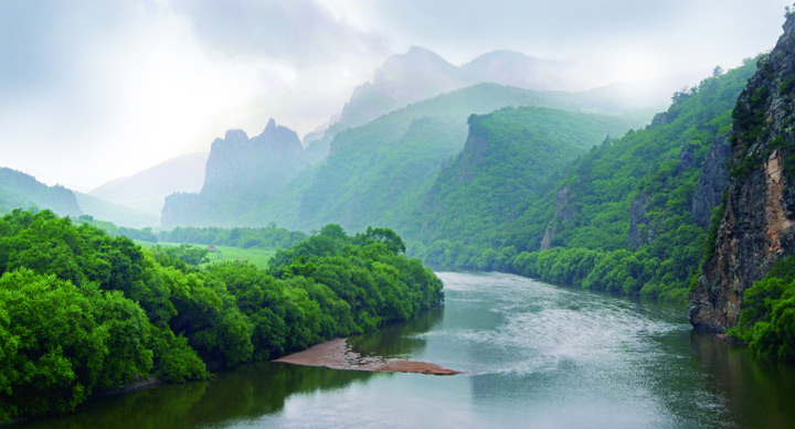 洞庭湖在群山懷抱的翡翠世界裡,彎彎曲曲的綏芬河穿流在風景區之中,河水靜謐剔透顯得格外安靜。置身於洞庭風景區,便仿佛置身於畫中,無論以何種角度欣賞,目光所及,皆是美景,人在洞庭走,如同畫中行。