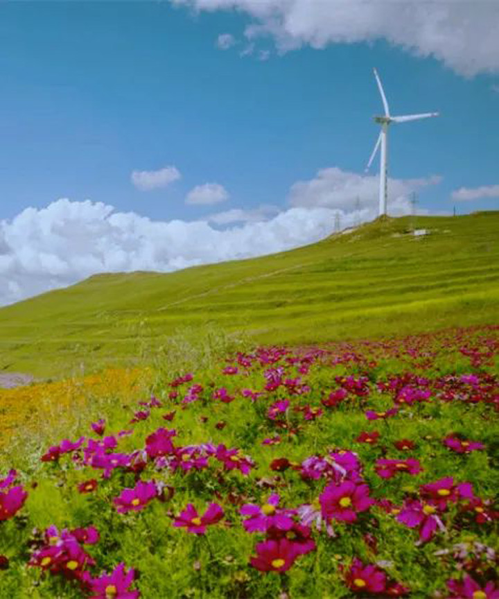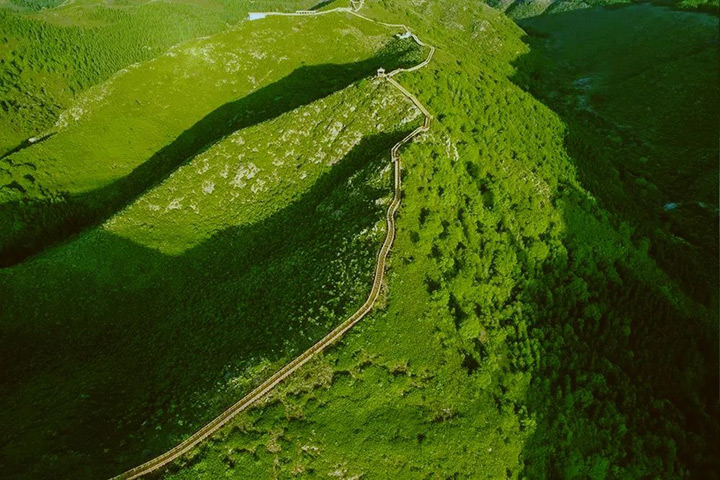 層層花海從大青山腳下盤旋而上,一直延伸到白雲繚繞的盡頭,長長的木棧道如同蜿蜒起伏的木長城盤旋起舞……