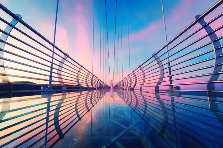 踏上這座網紅玻璃懸索橋,在群山環抱中淩空起舞,感受氣勢恢宏、靈動壯美的山間美景。