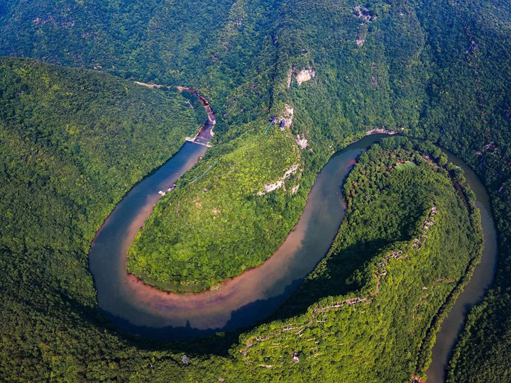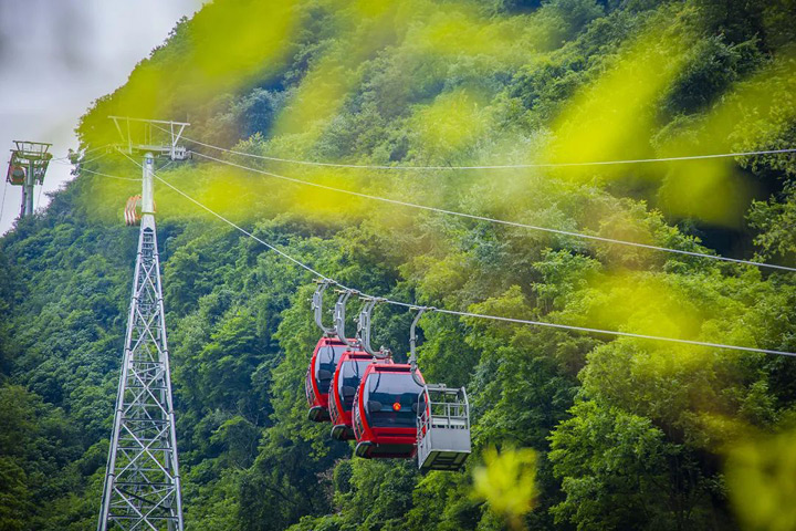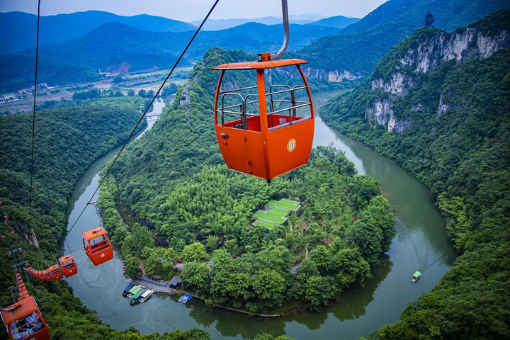 乘坐15分鐘的纜車直上山頂,在纜車上,可以完整地看到茅坪河,蜿蜒曲折,呈現神奇的八卦狀,中間凸起的山脈宛如大錦鯉的脊背,好像是在躍躍欲試,想要跳過前面的“龍門”。