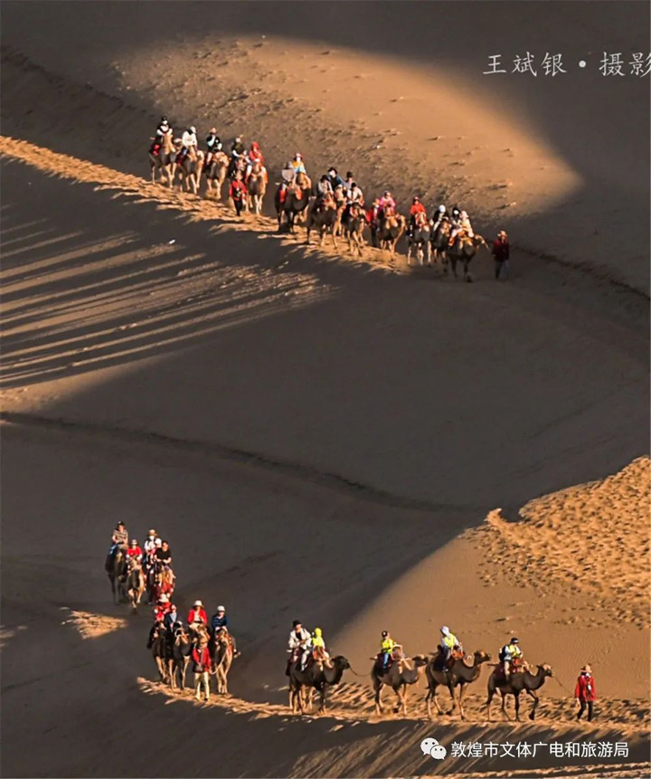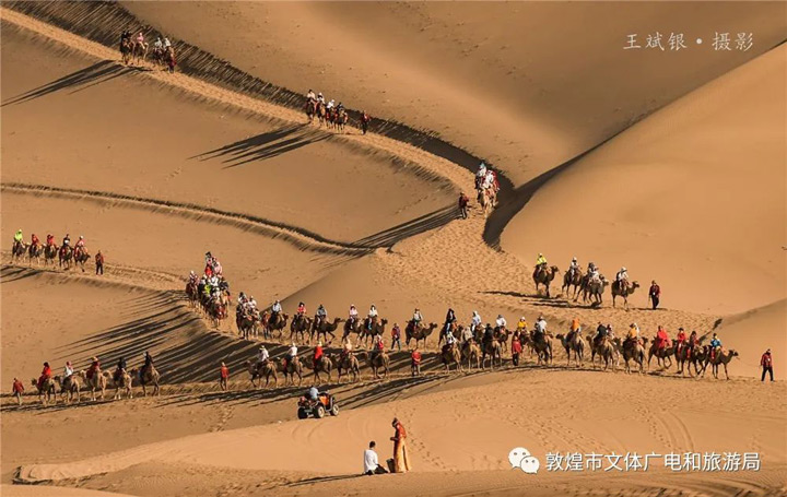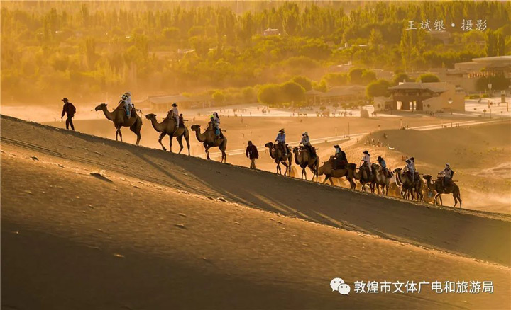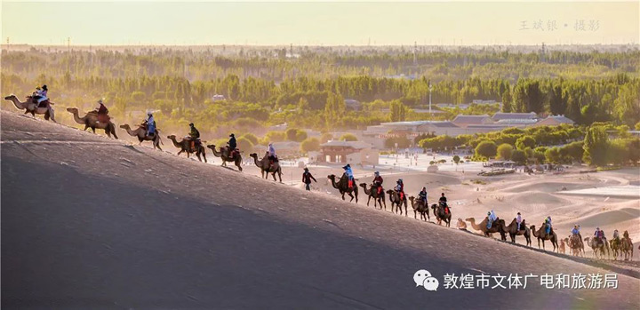 仲夏七月,大漠敦煌風和日麗,放下包袱,拋卻煩惱,輕裝上陣,騎上鳴沙山月牙泉景區的駱駝,登上高高的鳴沙山,一睹敦煌大漠綠洲無邊的綠色和遠處高樓大廈崛起的城市集群。驚歎時代之變換,感慨今日之敦煌。