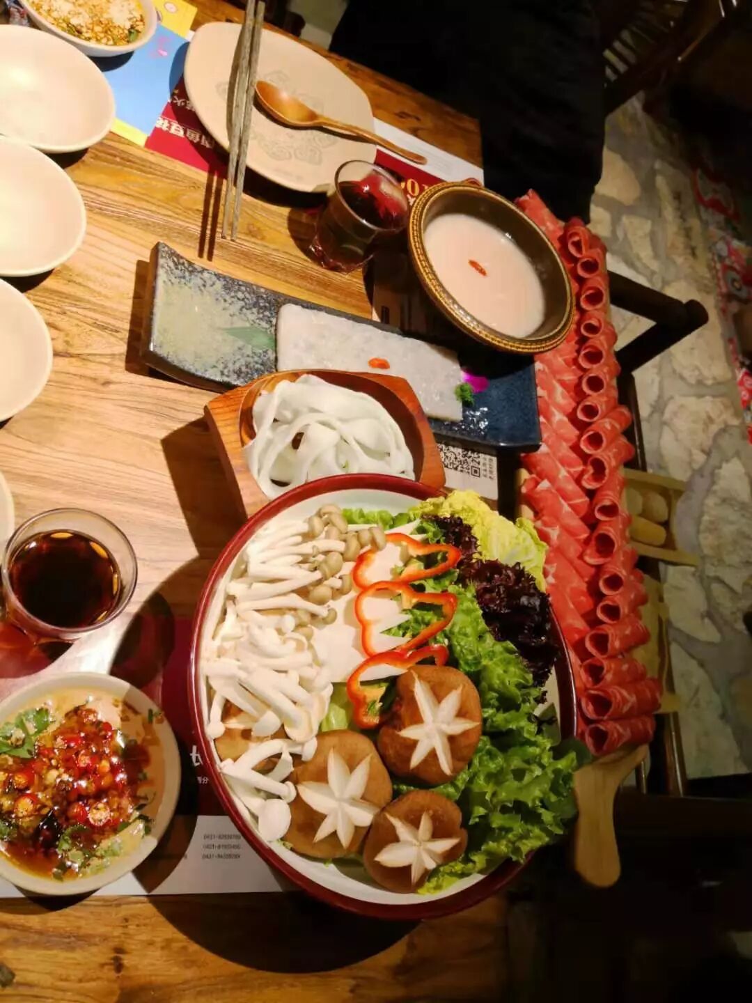開鍋先喝湯,茶色的湯底,入口齒頰生香,菌類的特殊香氣十分鮮美,鮮香之感穿透味蕾滲透到身體的每一個角落。看著店內精美的裝修,再品著可口的美食,彷彿去到那蒼山洱海間……