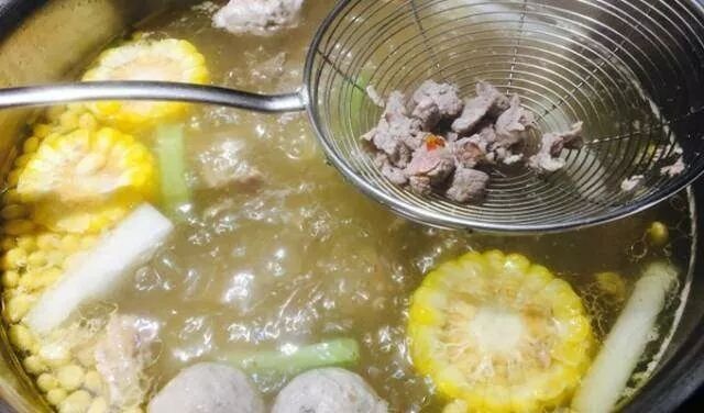 如果說傳統火鍋就像踏實穩重的“北方女子”,那紅油火鍋必須是熱辣辣的“川妹子”,而這潮汕火鍋就如同南方煙雨裡操著一口吳儂軟語的“小家碧玉”。潮汕火鍋都有開放式廚房,方便客人看到新鮮的現切肉的過程。鍋底採用牛肚湯搭配著牛蹄筋、蘿蔔條、玉米、牛肉丸。餐前先嚐嚐湯汁,有淡淡的牛奶香味呢。