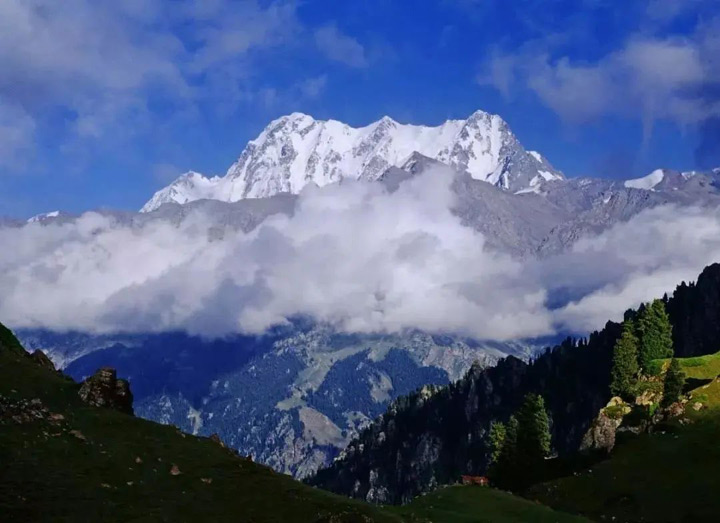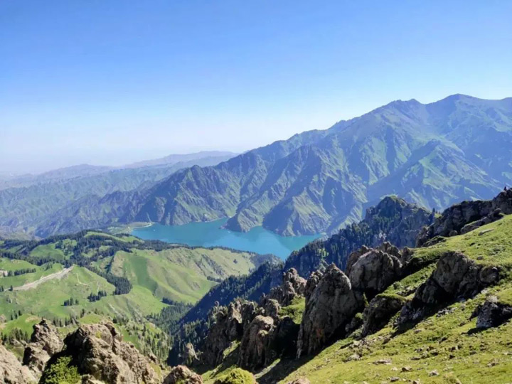 在馬牙山頂北望天池,滿目錦繡,東望柏格達和雪海三峰,西眺烏魯木齊,村莊雪峰都能盡收眼底。