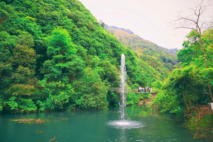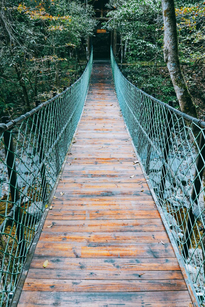 白鶴山莊是泰順為數不多有山有水有峽谷的地方。一座載入金氏世界紀錄的“世界最長鐵索橋”——“白鶴飛渡”橫跨飛雲湖之上,最是惹眼。358公尺的鐵索橋一橋飛架兩座風水寶地,行走其上,橋身左右搖晃擺動,直教人兩腿發軟,驚險又刺激。
