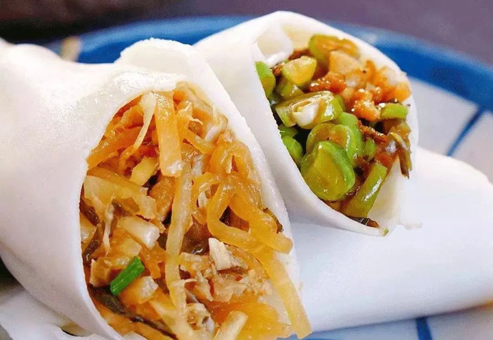 米麵層是泰順有名的經濟小吃之一,也是當地人最喜愛的早餐之一。一層薄薄的米麵皮嫩滑有嚼勁,裹著香噴噴的四季豆、豇豆、蘿蔔絲、豬肉、筍衣,一對折便可以吃了。