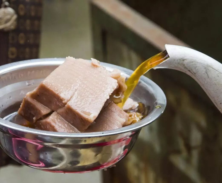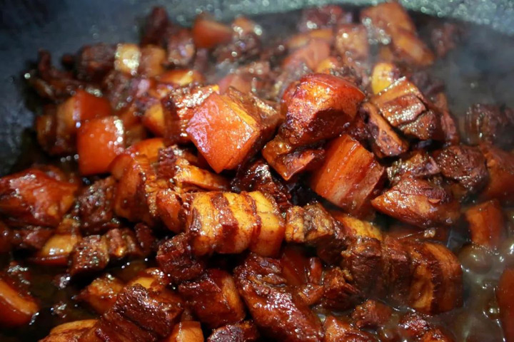 不用一粒飼料,農戶用自家粗糧飼養出的家豬品質極高,是洲嶺紅燒肉的關鍵。糟紅色的色澤,油而不膩,香味四散開來,讓人口水直流。咬一口那早已變得酥軟的豬肉,更是甘爽無比,回味無窮。