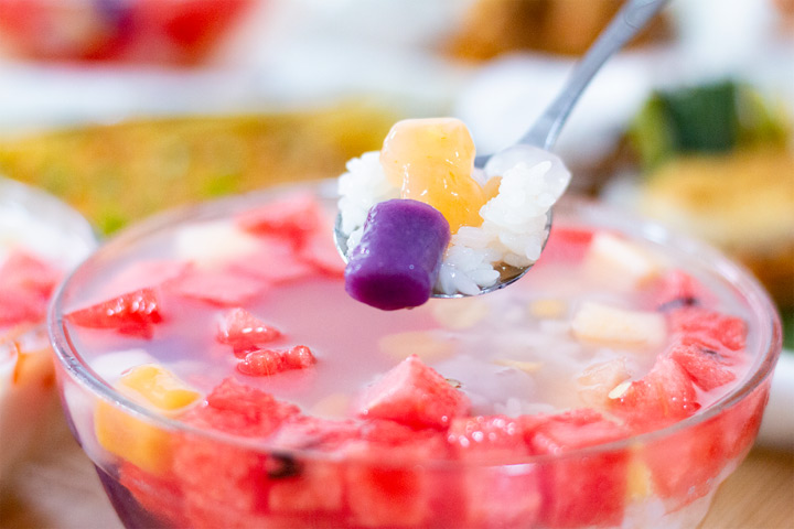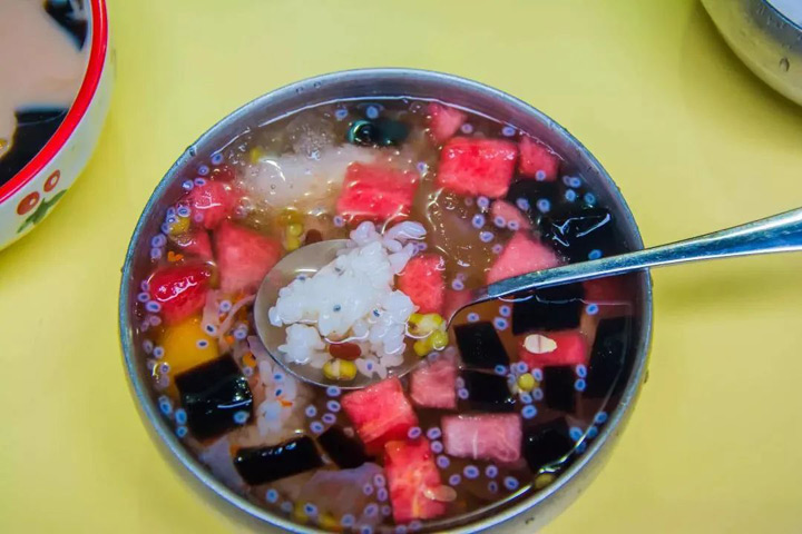冰飯裡有夏天的各種美味,甜滋滋的冰糖水為底,佐以糯米飯、葡萄乾、花生仁和各種水果。不同地方的配料雖有不同,卻都是滿滿清涼與快樂!