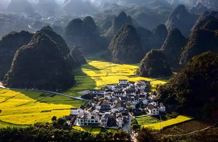 萬峰林四季皆美,各有千秋,尤其是春天,萬峰林的油菜花就開得繁花似錦。站在觀峰大道上,眺望西面,近峰遠峰,莽莽蒼蒼,一撒千里,蔚為壯觀。