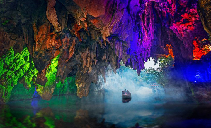 來龍宮水上行舟一定是重頭戲,欣賞被蜿蜒于龍宮奇峰異穀之下水溶洞,堪稱一絕。洞內景觀粗曠,鐘乳怪誕,如刀劈似斧削,潭深水幽,曲折神密,水幕電影光怪陸離,船行其中恍如“時光隧道”,妙趣橫生。