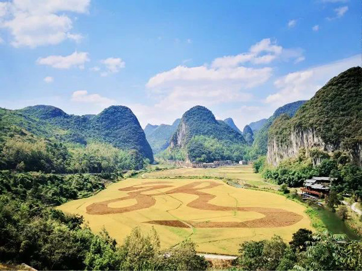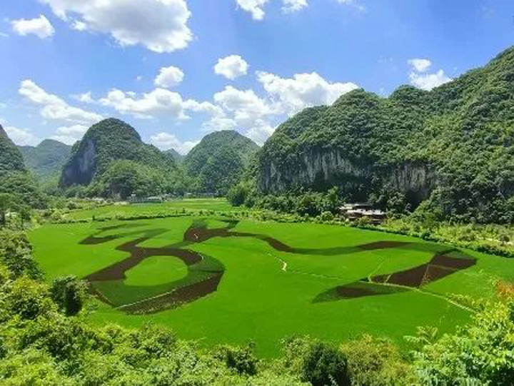 一片8萬平方公尺的油菜花海中,一個由油菜花與豆套種形成的巨大繁體“龍”字清晰可見。