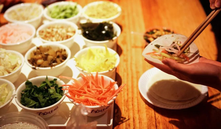 接著,左手攤開一張小麵皮,右手拈起幾根黃瓜絲、豆芽、涼麵放上,然後用麵皮緊緊包裹,放上幾顆脆哨,卷好後澆上幾勺酸湯或者是原湯,把麵皮淋透,一口放進嘴巴,面皮綿韌、配菜脆嫩,豐富的味覺在嘴裡蔓延開來。