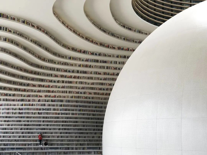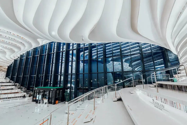 天津網紅圖書館,刷屏各大社交平臺,就連外網也不禁發出讚歎!設計立意“濱海之眼”和“書山有路勤為徑”,設計藏書總量達120萬冊。