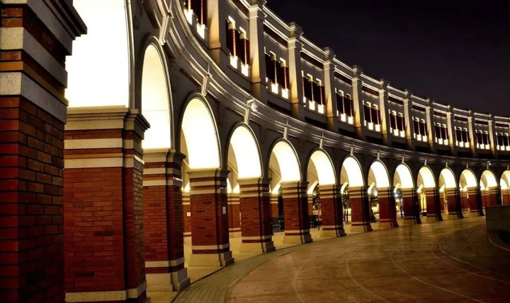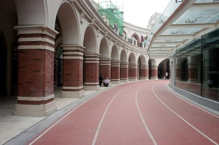 充滿羅馬風情的建築風格,透視感十足的回廊,綠色跑道有一種清新的校園感,和各式風貌的建築在一起進入畫面時把照片打造的十分高級。