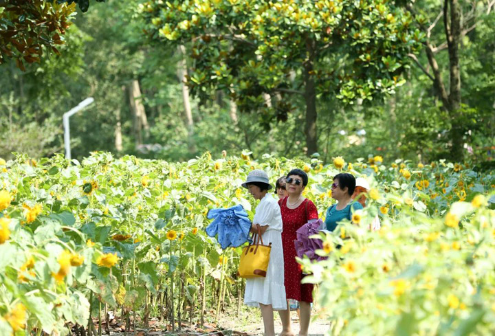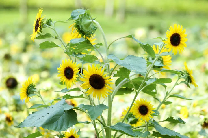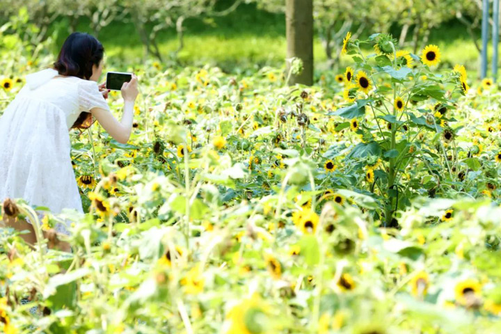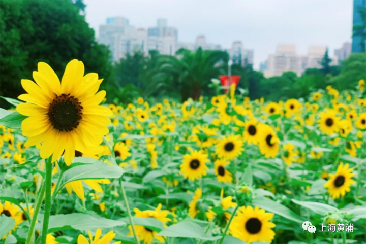 在黃浦區南園公園,經過綠地養護工人的悉心栽培,1600平方公尺的向日葵小苗已經朵朵綻放,在草坪小徑蜿蜒中向著太陽,風光旖旎,格外迷人。走進向日葵花海,花田小道縱橫交錯,被繁花擁簇其中,體會淡淡的花香和太陽的味道微妙融合。目光所及之處都是金燦燦的,在此處拍照打卡,一定會美不勝收!
