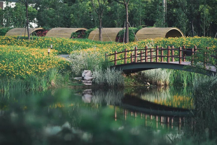 這片“陽光的海洋”就位於被稱為“上海外婆家”的嘉定區華亭鎮毛橋人家北側的愚農莊園期頤島,在這裡可是足足種了有一個島的金燦燦的向日葵。這裡的向日葵依地勢種植,錯落有致、此起彼伏,與其間忙著採蜜的蜜蜂、以及假山、茅草小屋相映成趣.