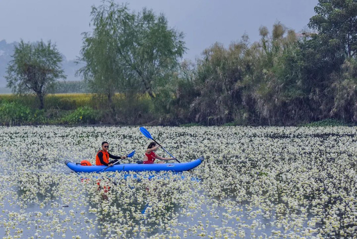 廣西河池,都安瑤族自治縣澄江河上大面積的海菜花綻放
