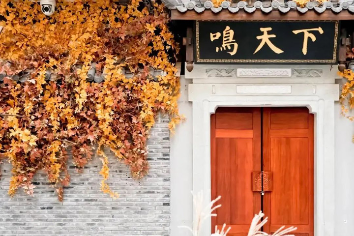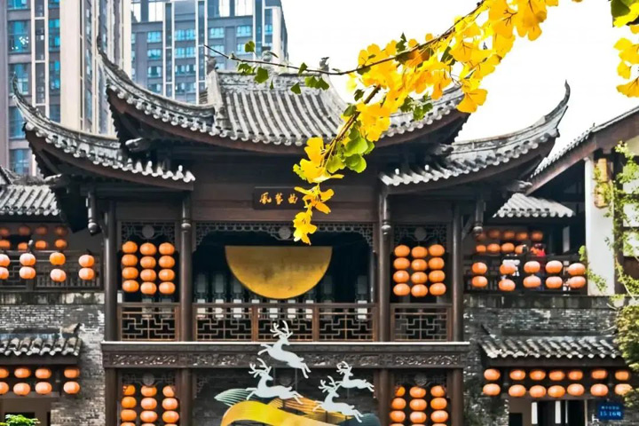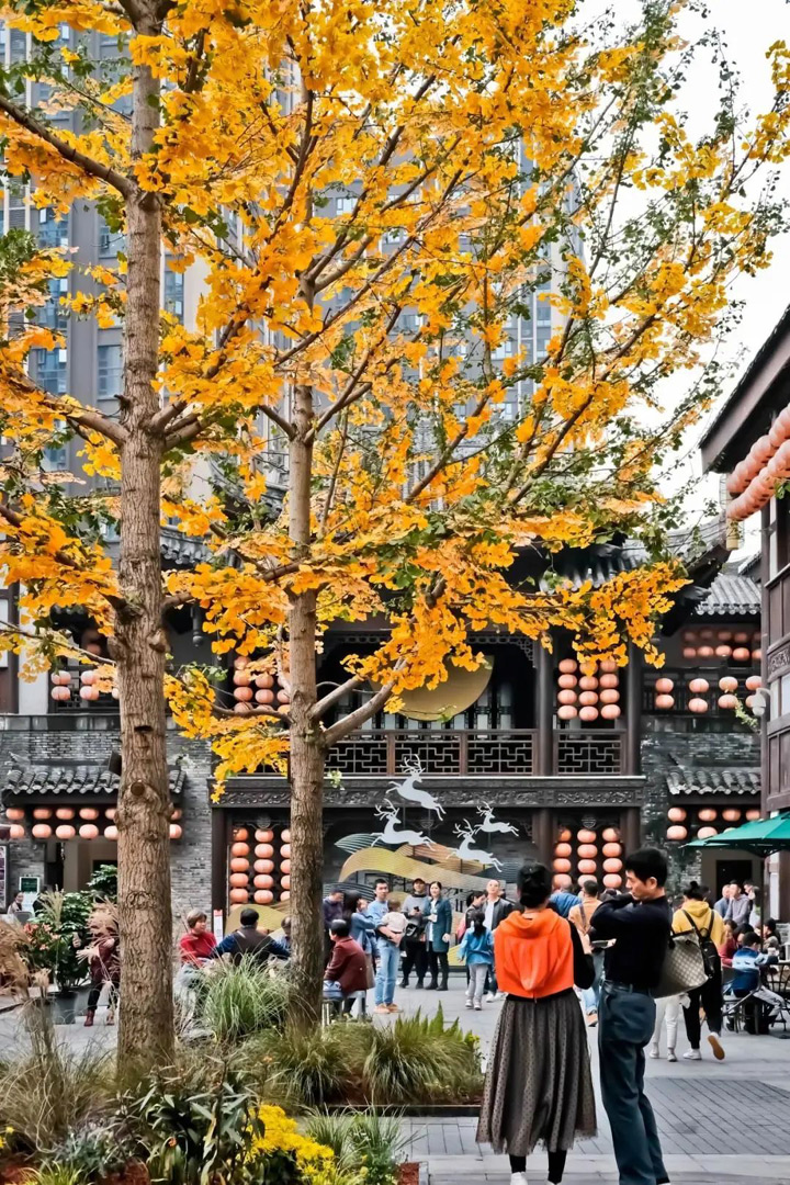 與仿古建築相映成趣的片片秋葉